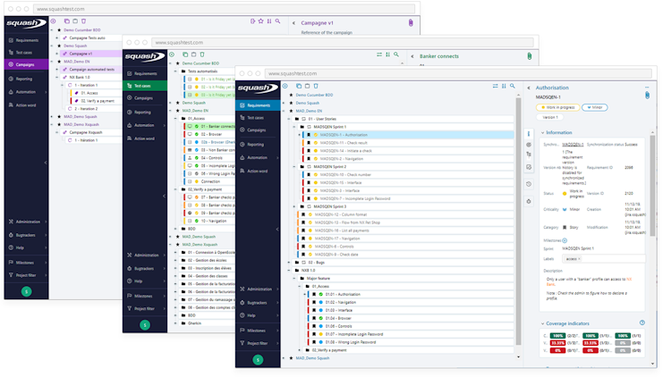 Squash enables incremental validation of the system under construction. From the design stage, users can define perennial test cases that become part of the non-regression harness and can be automated. By integrating with a variety of tools, including GitLab, Jira, Playwright, and Jenkins, Squash enhances DevSecOps platforms, distributing the value of functional testing to all project stakeholders on an ongoing basis.