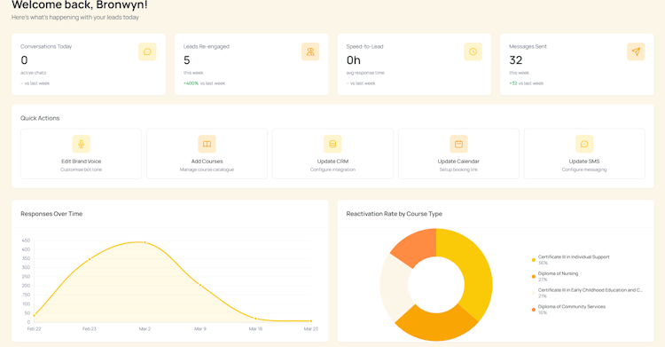 The platform delivers core functional capabilities centred around automated communication and lead management. The Speed to Lead feature initiates contact with new enquiries within sixty seconds of submission engaging prospects through SMS conversations that maintain a natural non scripted tone aligned with the institution brand voice. The Cold Lead Reactivation function systematically re engages previously unresponsive enquiries using contextually appropriate messaging designed to generate renewed interest. Herbot conducts intelligent context aware conversations that identify individual student goals address common objections related to costs timeframes and visa requirements and guide prospects toward either self service enrolment or scheduling appointments with human staff members. The system also handles repetitive enquiries autonomously with built in knowledge that covers the most frequent student questions.