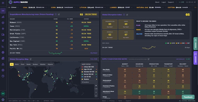 SupplyMaven is a supply chain risk intelligence platform that provides continuous monitoring and early warning of disruptions across global manufacturing, transportation, energy, and commodity networks. Freight forwarders, supply chain managers, commodity traders, and procurement teams benefit from advance visibility into emerging threats before they impact production operations. The platform aggregates and analyzes real-time data from forty-one ports and chokepoints, eighty-one border crossings, thirty-one commodities, and eight regional power grids.