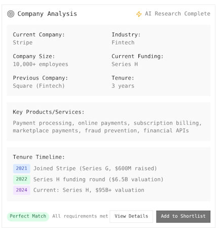 The platform’s core functionality centers on an AI driven candidate evaluation system that processes exported LinkedIn Recruiter search results and classifies candidates into tiered categories based on customizable requirement specifications. Users interact with an AI Requirements Agent that facilitates the creation of detailed evaluation criteria distinguishing between must have and nice to have qualifications, industry background preferences, company characteristics and complex skill combinations using weighted scoring capabilities. The system performs company research that extends beyond LinkedIn available data by analyzing employer funding stages, organization size metrics, industry focus areas and growth phases through multi source data aggregation. Each candidate assessment includes detailed reasoning documentation, confidence scores and context about current and previous employers, such as tenure timelines, funding round progression and valuation milestones. The evaluation engine achieves a reported high accuracy rate and provides standardized assessment protocols to ensure consistency across recruitment teams. The platform processes one thousand candidate profiles in a single evaluation cycle and generates talent pool analytics that offer strategic insights into distribution patterns and market intelligence.