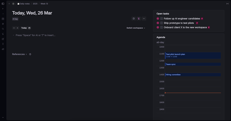 Tana has a desktop app, as well as Android and iOS apps so you can stay on top of your information on the go. It also connects with Google Calendar for seamless meeting transcripts and summaries.