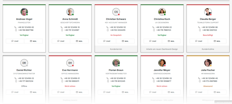 The platform offers four configurable viewing modes—card view, compact view, minimal view and list view—that administrators can select based on screen size, physical location and information-density preferences. Automatic status synchronization occurs every fifteen seconds. Live presence data is pulled directly from Microsoft Teams to present availability states such as available, busy, in meeting and away. Each employee entry displays contact telephone numbers within the main interface and enables one-click calling. Status messages and out-of-office notifications appear immediately alongside presence indicators.