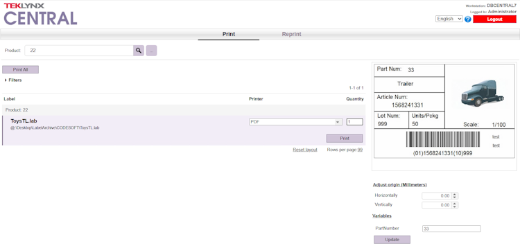 TEKLYNX CENTAL is a centralized label management. The solution combines CODESOFT, SENTINEL, and LABEL ARCHIVE into a single solution that supports manufacturing environment.