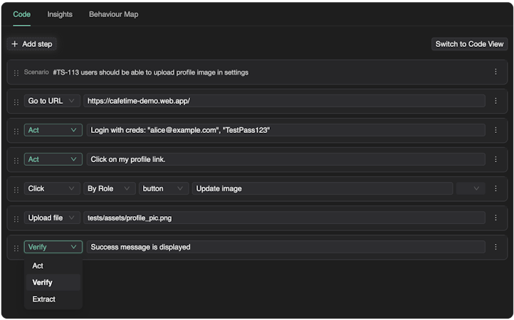 The core of TestChimp lies in SmartTests, which are standard Playwright scripts extended with AI commands for plain English steps. Test authors can embed ai.act and ai.verify calls alongside traditional scripted steps to balance stability and flexibility. SmartTests execute in continuous integration environments with the familiar Playwright runner. Built-in requirement traceability is achieved via in-code scenario linking, enabling tests to reference specific scenarios and screens within code comments. A visual no-code editor sits on top of the underlying code, allowing non-technical contributors to create and modify tests without risking syntax errors. Test generation is supported through plain English scenario descriptions, manual step recording via a browser extension and direct import of existing Playwright folders.