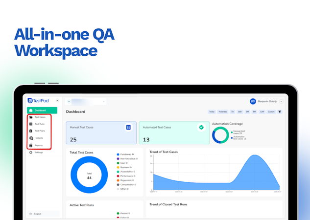 TestPod is an AI enabled test management platform designed to support software development teams in planning, organizing and tracking both manual and automated testing activities within a centralized workspace. The platform addresses limitations of spreadsheet based workflows by unifying processes for requirement management, test case creation and execution. It serves quality assurance professionals, software developers, product managers and technical leaders in organizations from startups to large enterprises. The solution aligns with Agile methodologies and continuous delivery practices by combining spreadsheet style simplicity with enterprise level functionality across the complete testing lifecycle.