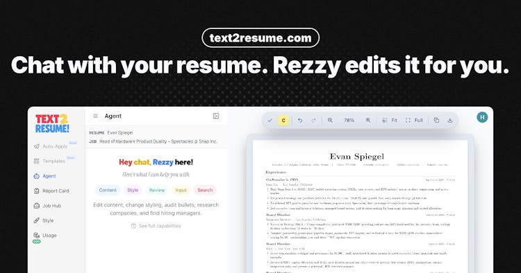 Text2Resume is a job application tracker and AI resume builder. Users track applications, save job postings, find hiring managers via LinkedIn search, and manage contacts in one place. The AI agent, Rezzy, edits resume through natural conversation instead of menus or templates.
