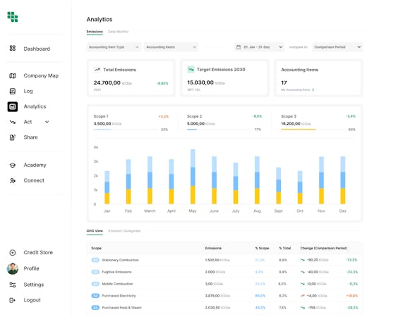 today.green assists companies in managing their entire sustainability in one place. This encompasses accounting for carbon footprint (CCFs & PCFs), conducting detailed analytics (including supply chain analysis), modeling CO2 scenarios, setting science-based targets, and achieving effective CO2 reductions. The platform also enables the assessment of your ESG performance and conducting the double materiality assessment with your stakeholders for CRSD disclosures. With this intuitive platform, complex carbon footprints are made visible and manageable. Our real-time analytics and stakeholder engagement tools support your sustainability journey.