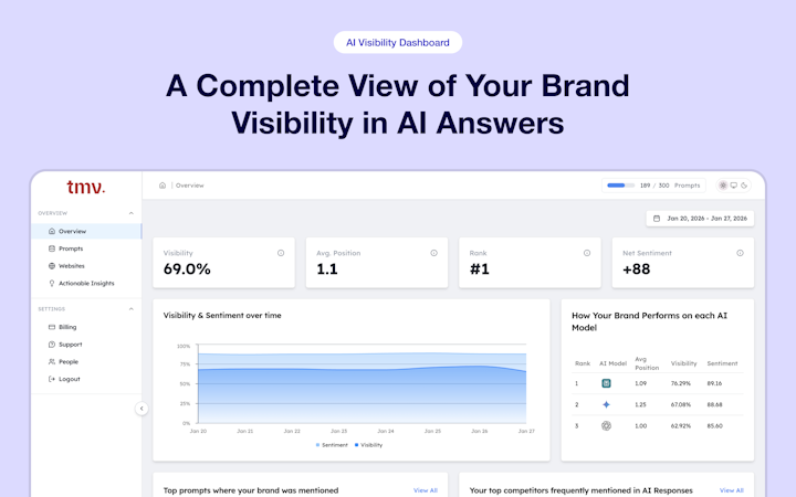Track My Visibility is an AI search visibility monitoring platform that enables organizations to measure, analyze, and optimize how their brand appears within AI-generated responses across multiple large language model platforms. The software serves SEO teams, public relations and communications departments, ecommerce brands, and marketing agencies that require detailed insights into brand presence within AI-powered search outputs. By tracking citations, mentions, and ranking positions across ChatGPT, Claude, Perplexity, and Gemini, the platform provides visibility into how AI engines reference and recommend brand content in response to customer queries. The solution addresses the need for brands to maintain authority and presence within AI-generated answers as these tools increasingly function as alternative channels for information discovery.