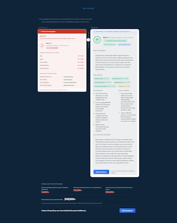 A transferable skill mapping feature identifies competencies that align with role requirements even when candidates employ industry specific or nontraditional vocabulary. The dedicated veteran translation mode converts military occupational specialty codes, security clearance levels, training credentials, and service experience into civilian job requirement equivalents by translating ranks, leadership scope, personnel management, budget responsibilities, and operational roles. The LinkedIn profile scan functionality cross references candidate online profiles to enrich assessments with career progression insights, endorsements, and public content. The job description analyzer evaluates posted roles before screening, highlighting unrealistic criteria, missing qualifications, and potential bias in role descriptions.