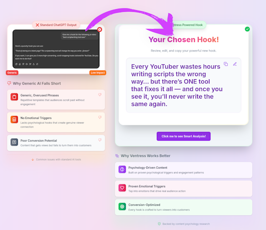 The platform features a comprehensive suite of content creation and optimization tools, including fact-checking capabilities that verify information against trusted sources to ensure content accuracy. Ventress provides script optimization functionality that helps creators craft engaging content based on specific goals, tone, and target audience preferences. The software includes a content analysis system that examines YouTube videos and delivers detailed insights on performance scores, sentiment analysis, and watch intensity metrics. Additional features include a content explorer for discovering trending topics, video title generation for improved searchability and click-through rates, writing style replication to maintain authentic voice, competitive analysis tools for identifying opportunities in crowded niches, and description optimization for enhanced discoverability.