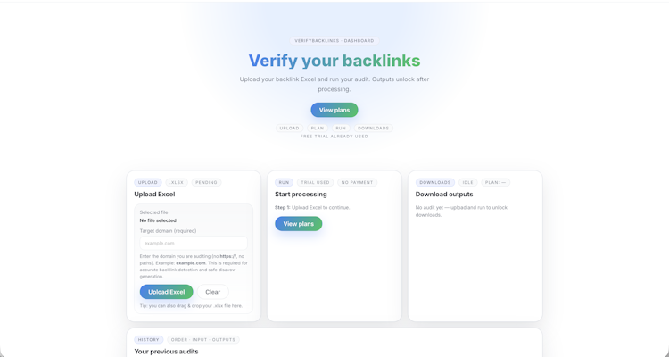 VerifyBacklinks is a backlink verification engine designed to perform live URL audits for backlink presence, signal evaluation and placement confirmation. It supports both pre-index audits before search engines crawl links and post-index audits after indexing to confirm ongoing accessibility and value. The platform operates on a pay-per-audit model without subscription commitments and accepts Excel files exported from a variety of SEO tools and vendor or agency exports. Clients receive actionable link assessments categorized as keep, review or consider disavow based on live verification results.