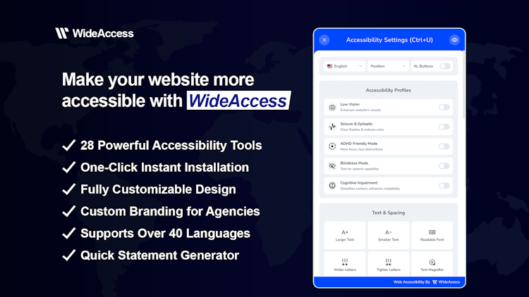 WideAccess empowers businesses to make their websites more accessible and user-friendly with an all-in-one accessibility solution. Trusted by modern websites worldwide, its smart widget instantly enhances usability, offering 23 powerful accessibility tools and support for over 40 languages. With one-minute installation and seamless integration with platforms like WordPress, Shopify, Wix, and Webflow, etc. WideAccess is fully customizable to match your brand while providing ongoing updates to keep your website inclusive for all visitors.