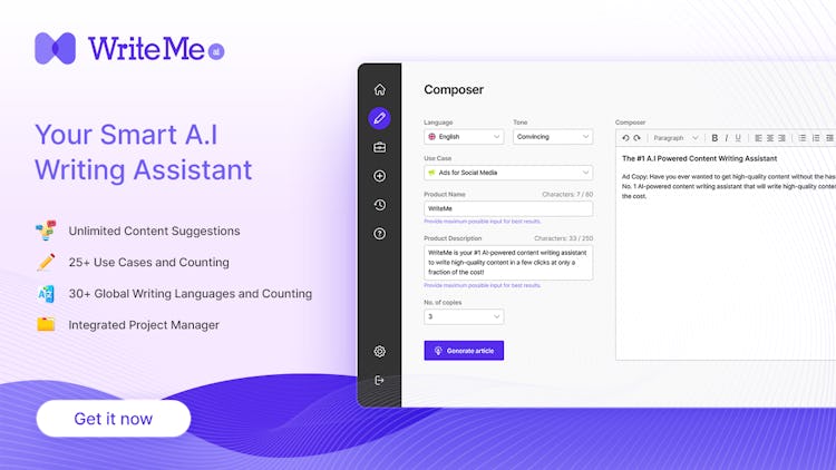 WriteMe is a powerful AI writing tool is designed for writers who are ready to write more. Simply input your topic details and keywords in the AI content writer and get original, comprehensive and flawless content in a jiffy!