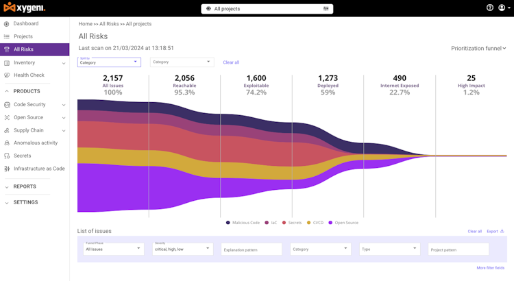 - Clear Prioritization of Real Risk: Xygeni eliminates alert noise by focusing on what is actually exploitable and business-relevant. AI-driven reachability analysis and contextual triage ensure teams fix the right issues first, not just the loudest ones.