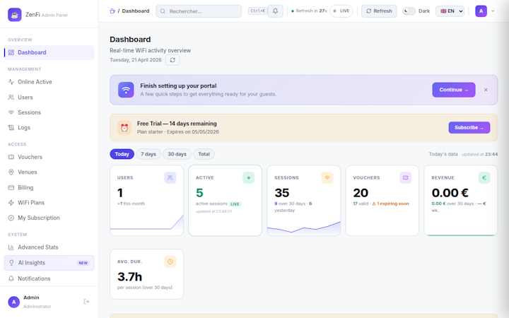 ZenFi is a cloud based WiFi management platform designed to centralize administration of guest network access, voucher distribution, payment processing and usage analytics for hospitality and commercial venues. The platform provides a unified interface for managing multiple locations with customizable captive portals that can be branded with venue specific logos, color palettes and welcome messages. The multi tenant architecture allows all configurations to be managed under a single account while maintaining independent statistics and access pools for each site. ZenFi supports a range of venue types including hotels, bed and breakfasts, cafes, restaurants, coworking spaces, gaming lounges and airport lounges.