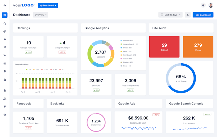 AgencyAnalytics allows users to create custom dashboards for an overview of their clients’ campaigns, with the ability to drag-and-drop various widgets providing information on Google and Bing rankings, number of backlinks and linking domains, engagement across multiple social media platforms, and statistics from Google Adwords, Analytics, and Search Console integrations. Dashboards can be customized and branded for each campaign, enabling users to personalize the information presented to each client based on the metrics that matter most.
