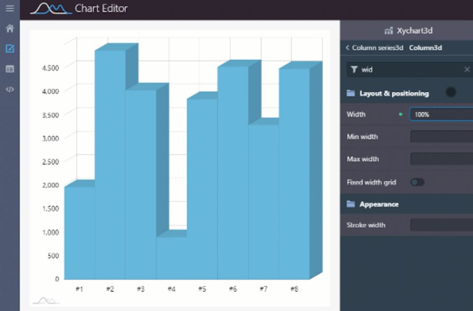 amCharts allows organizations to customize graphs by applying multiple animations and set up colors, transparency levels, gradients, or patterns for visualized insights. The editor helps managers utilize pre-programmed themes and templates to create bar, column, pie, donut, area, and XY charts. Businesses can access country or region maps, configure text's font, size or styling and add zoom-in or out, heat scales, and mini-maps to control visualized data.