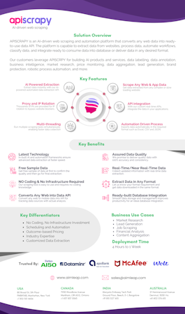 Our customers leverage APISCRAPY for building AI products and services, data labelling, data annotation, business intelligence, market research, price monitoring, data aggregation, lead generation, brand protection, robotic process automation, and more.