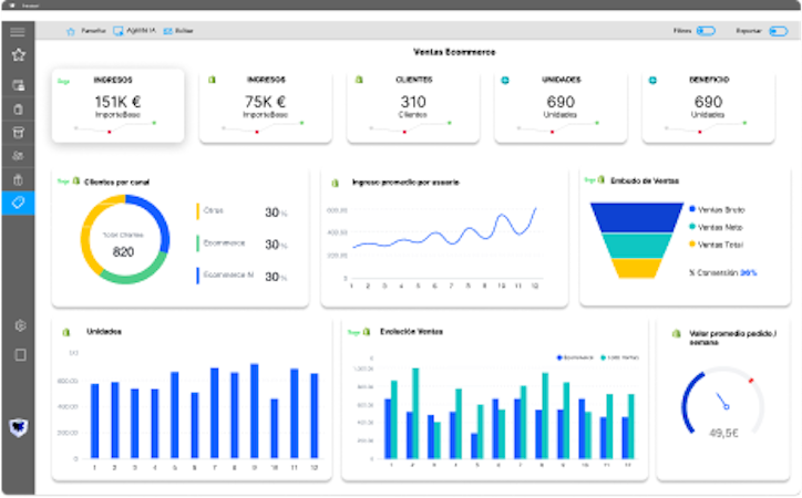 BI Studio is a business intelligence solution that offers pre-built key performance indicators and dashboards that are ready to use across various business areas, such as sales, finance, eCommerce, marketing, and human resources.