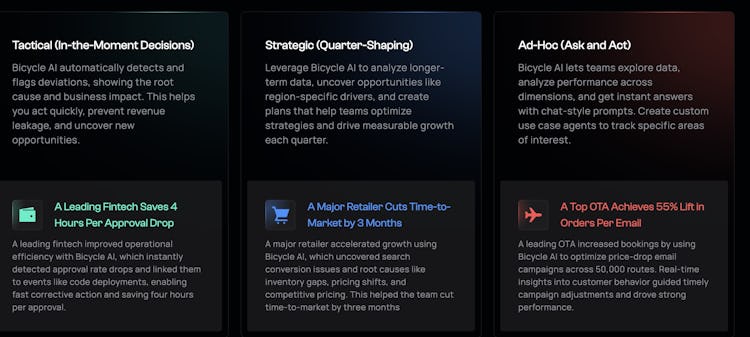 Bicycle AI employs prebuilt AI agents powered by advanced machine learning models that incorporate deep domain logic and event models specific to industry verticals. Conversational analytics capabilities allow users to explore data through natural language queries and chat-style prompts, eliminating dependence on data teams for ad-hoc analysis. The platform supports tactical decision making through real-time deviation detection and strategic planning through longer-term trend analysis across multiple dimensions. Custom use case agents can be configured to monitor defined business areas, routing insights and recommended actions to appropriate stakeholders through channels such as messaging integrations and system triggers.
