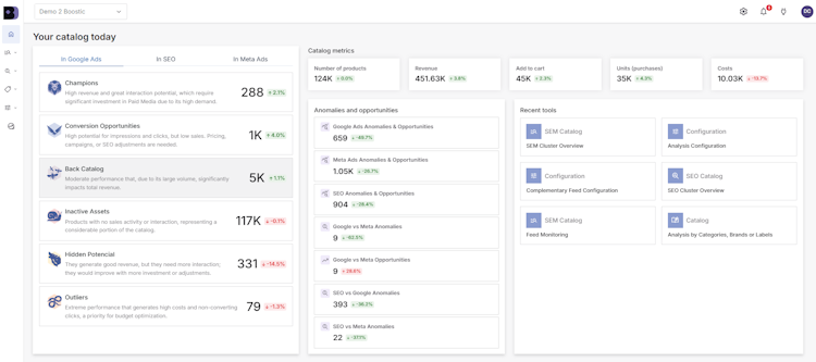 The platform features a catalog analysis system that clusters products based on performance metrics and return on investment. It automatically detects products that consume budget without generating sufficient returns and identifies items with strong organic traffic or high margins that remain unexploited. It eliminates cannibalization through centralized management. An automated tagging system applies intelligent labels to Google Merchant and Meta feeds to enable improved segmentation in advertising campaigns. The system reorganizes products into clusters based on user behavior. Comprehensive dashboards support data segmentation through custom tags, categories, brands, clusters, and subclusters. The software detects product issues, anomalies, and hidden potential using multiple reference indices. Artificial intelligence generates clear, actionable insights for each stock keeping unit.
