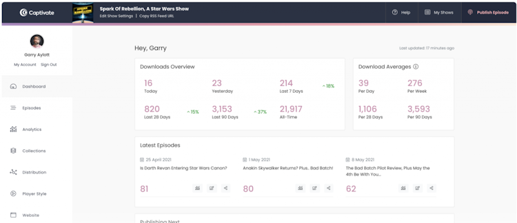 Captivate is a podcast hosting software designed to help businesses create, distribute, and promote podcast episodes on a centralized platform. Supervisors can use the dashboard to publish episodes, view upcoming schedules, and gain an overview of average downloads based on specific dates.