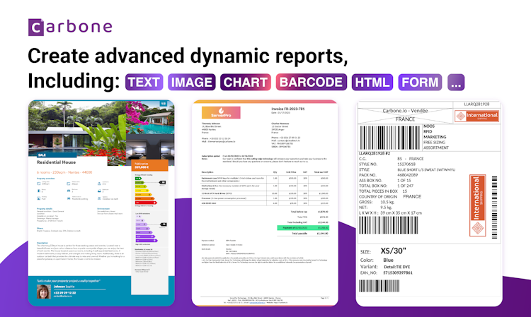 Optimize your document workflow with Carbone. Craft templates using familiar tools like Word, Excel, LibreOffice, or Google Docs, and supply your data in JSON format. Carbone seamlessly integrates your data into templates to produce polished reports.