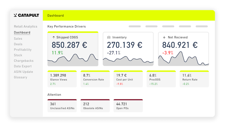CATAPULT is a modular Amazon analytics suite for 1P vendors. In three hubs—Retail, Digital Shelf and Media—Sales, Content and Marketing teams have everything they need to operate across countries.