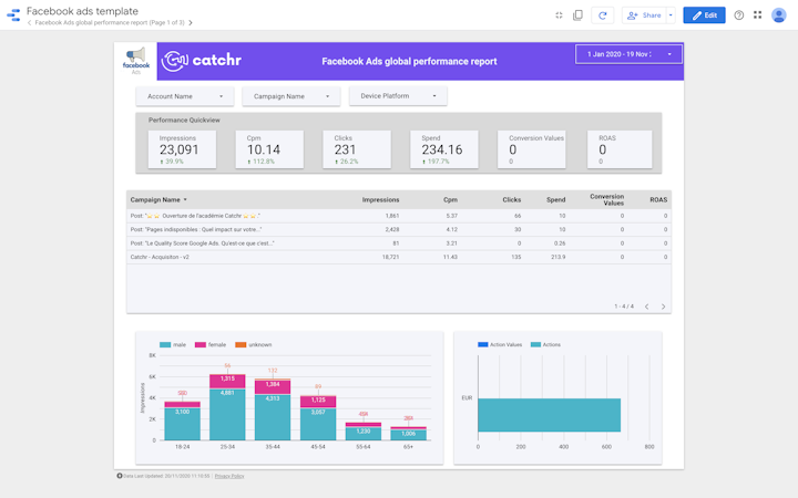 We create connectors ( facebook ads, google ads, Linkedin ads, twitter ads, bing ads ... ) which aim to facilitate the use of google data studio and the visualization of reports.