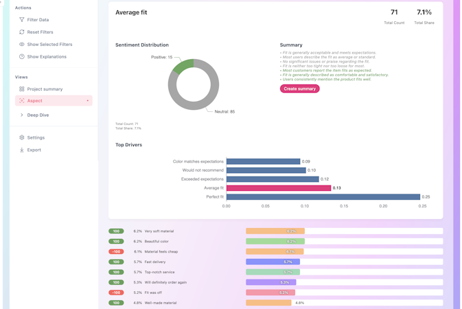 • Interactive Dashboards: Explore key topics, sentiment trends, and driver models via visual dashboards. Filter by metadata, highlight segments, compare over time.