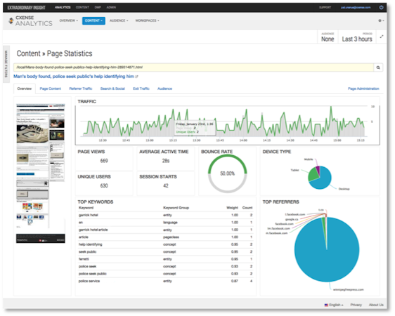 Cxense Insight shows you how users consume content on your site in real time so you can provide a better user experience and drive higher digital revenue. We capture all relevant traffic and events across desktop, tablet and mobile devices, and display the information in intuitive dashboards.
