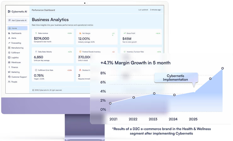 Cybernetis AI is an enterprise software platform designed to unify operations across marketing, sales, supply chain, finance, and logistics. It transforms raw data from multiple sources including ERPs, Shopify, spreadsheets, and other enterprise systems into a centralized foundation. Using advanced AI algorithms, the platform provides predictive analytics, real-time insights, and process automation. Core functionalities include demand forecasting, inventory optimization, supplier order automation, and financial outcome simulation to optimize pricing, marketing, and fulfillment.