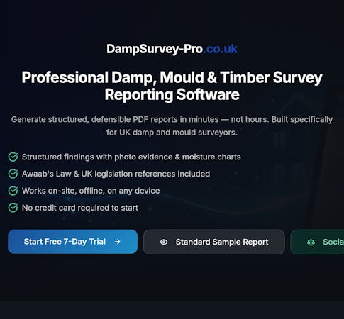 DampSurvey Pro is a specialized survey reporting software designed for UK-based damp, mould and timber surveyors. It provides a compliance-focused solution that replaces manual report writing and generic form builders with structured PDF outputs. The platform generates branded reports encompassing executive summaries, room-by-room findings, moisture analysis charts, photographic evidence and prioritised remedial recommendations. It supports independent surveyors, damp and mould specialists, social housing entities, regulatory authorities and surveying firms requiring defensible documentation.
