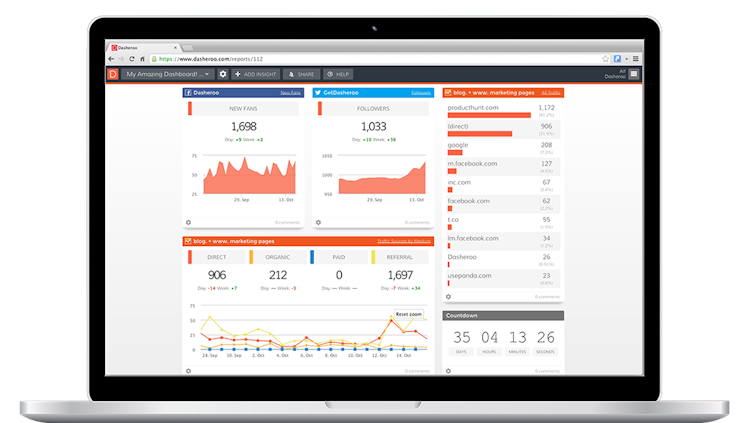 Dasheroo Business Dashboards - Monitor your metrics from apps like Facebook, Google Analytics, Twitter, Instagram, MailChimp, Salesforce, LinkedIn and many more all in one place, free!