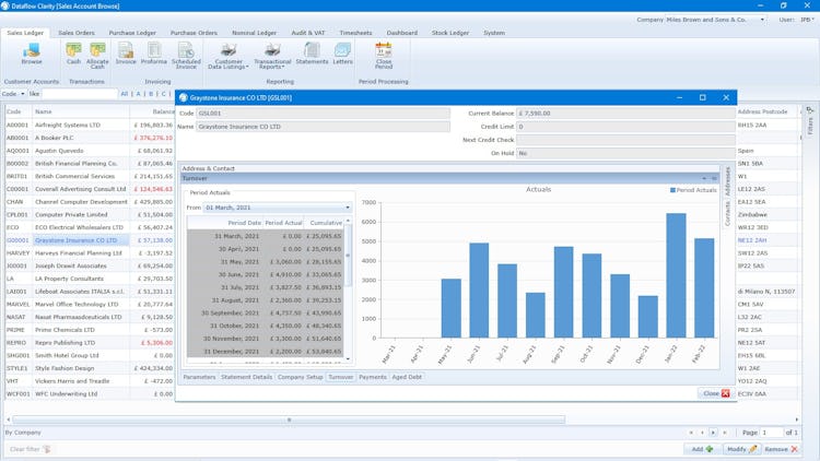 Dataflow Clarity offers a range of financial tools for managing payables, receivables, stock, ordering, taxes, reporting, and more. Real-time data and drilldown reporting provides users with insight into a variety of financial metrics such as cash positions, liabilities, inventory margins, and profitability ratios.
