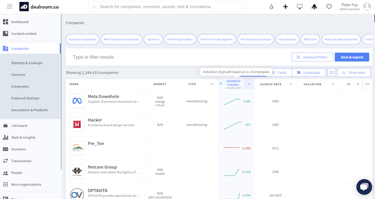 Dealroom’s user interface