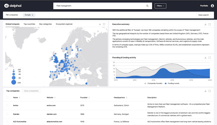 Linked areas, such as transport and logistics as an example, can be related to each other. delphai can identify how companies or technologies are interrelated, and it can also indicate the companies active at the intersections. It allows users to identify market participants in relevant industries, along with possible partners and competitors.