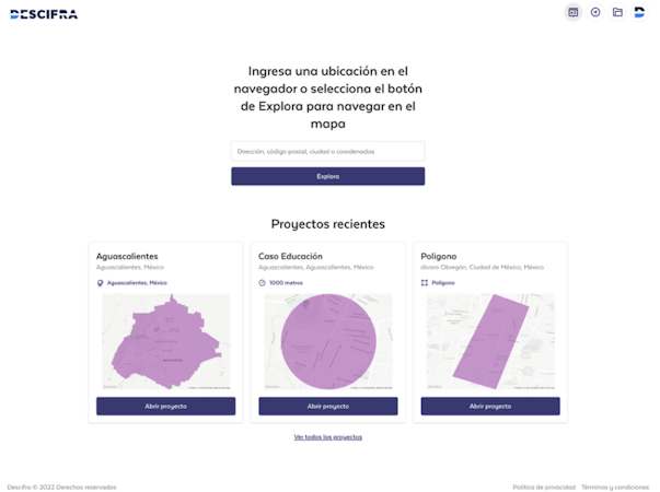 The solution allows users to analyze territories, generate analysis projects, and filter and compare areas. It provides insights to know customers by analyzing their socio-demographic profile, tastes, interests, preferences and geographic environment. DESCIFRA can discover where potential customers are located to generate new audiences and increase business visibility. It also predicts sales and determines market value to define the next point of sales.