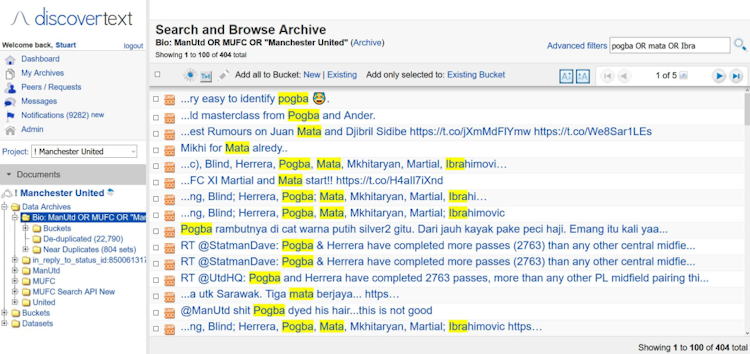 Users can take advantage of features such as Boolean defined search, interactive word clouds, n-grams, and custom mini topic dictionaries, as well as filter items by date, geography, influence, networks, place name, and a variety of other metadata values. Features for deduplication and automated clustering of similar text allow users to create groupings to further accelerate the training of machine classifiers. Custom, complex search queries and human coding schemes can be saved for reuse at a later date.