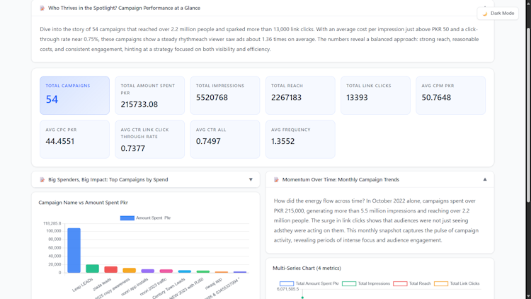 The software features a comprehensive suite of analytical capabilities centered around its core functionalities. Smart Ask allows users to query data in plain English, receiving instant analysis without technical syntax requirements. The Fusion Intelligence Core combines multiple AI models, including OpenAI and Gemini, to deliver analytical results. For visualization and reporting, EasyAIBridge offers auto-generated charts, tables, and insights that can be exported in multiple formats including PDF, HTML, Excel, and CSV. The Smart Extract feature enables users to pull specific data subsets with accompanying AI analysis, while Gap-Filling Intelligence uses domain knowledge to infer missing metrics when data is incomplete. The platform also includes Portable BI functionality, allowing users to combine multiple dashboards into shareable consolidated views while preserving filters, styles, and dual-axis scales.