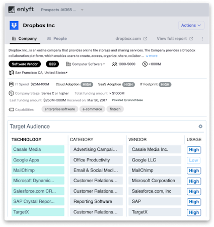 Enlyft layers usage data from tens of thousands of technologies, along with tough-to-find indicators such as funding status, SaaS adoption, Cloud adoption, and other details teams can use to focus on the right customer with the right information, every time. For small businesses to multinational enterprises, Enlyft goes further than data enrichment and contact databases, doing what both of those techs do and more to give you an end-to-end prospecting solution that works with the tools you use every day to get dramatically better outcomes in sales, marketing, and growth, delivered as a SaaS platform and regularly updated with new data, features, and capabilities.
