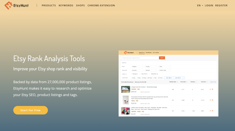 With this Etsy tool, users can access historical sales, prices, favorites, and review data for top-selling Etsy products across various categories. The tool is regularly updated to ensure users don't miss out on any niche products. Additionally, EtsyHunt provides information on Amazon Handmade products and Etsy inactive products. The platform also includes an Etsy keyword tool that displays popular keywords and their corresponding Etsy stats, helping users improve their Etsy SEO.
