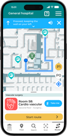 •Directions and wayfinding: The user selects a destination within the space and receives a map with detailed instructions based on their location, making it easy to reach the destination.