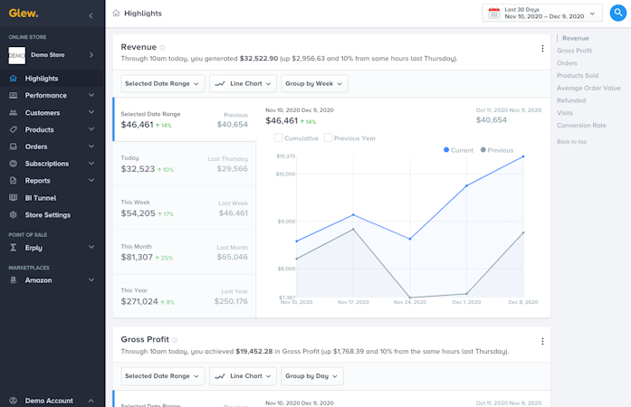 Glew is a multichannel eCommerce analytics tool for stores hosted on WooCommerce, Shopify and Magento offering customer insights, merchandise analytics and performance reports for online retailers and digital agencies. Users can connect all the platforms that run their business in one place, and extract, transform, load (ETL) data for seamless cross-channel reporting, and get actionable insights using data visualizations, automated reports, alerts and more.