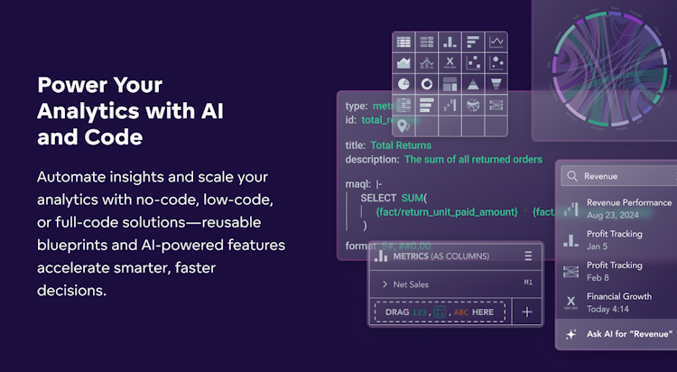 GoodData is the end-to-end analytics platform that enables organizations and data product builders to transform raw data into actionable insights. It provides comprehensive solutions, including pipeline integration, data modeling, visualizations, embedding, and AI capabilities, all of which can be managed through code or an intuitive user interface. With advanced tools for data visualization, reporting, and dashboard creation, GoodData delivers customized data products to support informed, data-driven decisions.