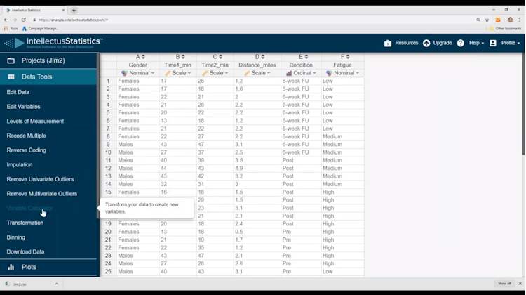 Intellectus Statistics provides tools that allow students to select variables for statistical tests, preload assumptions such as normality and homoscedasticity, and define levels of measurement before analysis. It also helps users perform multiple data management tasks including reverse coding, composite score computation, transformation, and imputation.