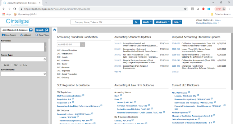Intelligize is a cloud-based compliance management tool that helps corporate businesses, law, accounting, and consultancy firms, and educational institutions collect and analyze various documents to streamline legal research processes. Managers can search through the Securities and Exchange Commission (SEC) database and compare previous amendments or comments using redlining capabilities.
