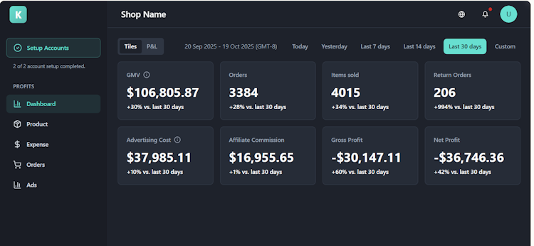Kixmon is a TikTok shop profit tracker designed to give sellers complete financial visibility and accuracy. With real-time, automated profit tracking, Kixmon connects directly through TikTok’s official APIs to consolidate every key metric — sales, GMV Max Ads spend, promos, referral fees, shipping fees (FBT, TikTok Shipping & Seller Shipping), affiliate and partner commissions, non-order adjustments, refunds, and net profit — all in a unified dashboard.