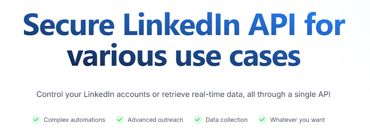 The platform's second product, Data API, provides instant access to LinkedIn's public data without requiring account connection. Unlike solutions like Clay or Apollo that rely on outdated databases, Data API retrieves information in real-time directly from LinkedIn - perfect for sales intelligence, recruitment, and research tasks.