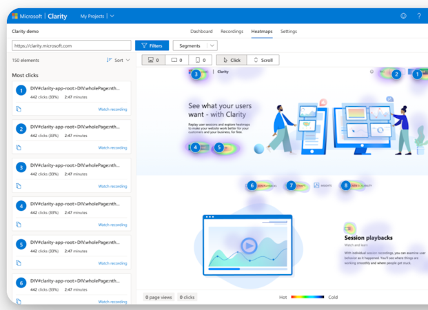 Clarity is a cloud-based tool that helps businesses analyze and capture user behavior across websites. Clarity allows organizations to generate instant heatmaps to gain an overview of the engagement levels of each page. It provides session recordings to help watch how people use the site.
